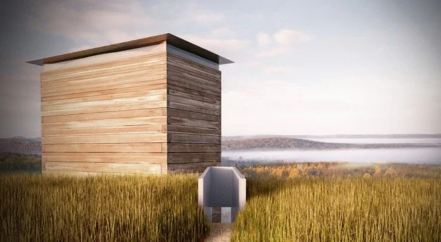 This simple log cabin on a pond stands at the crest of a hill with cascading terraces and expansive views of a distant lake. The simple structure is formed of reconditioned cedar logs, sourced near the site, and redressed at a local sawmill. A clerestory filters light to illuminate hanging panels of polished stainless steel. The interior of the cabin is finished smooth with a slight sheen, and hints of cedar fill the single open room. A secondary room lies within the hillside with views of the pond. A third exterior space is recessed into the pond itself, inviting small gatherings around an open fire pit.